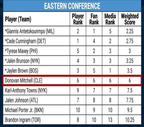 先说东部,首发五人不管是球员投票、球迷投票还是媒体投票都在前五,因此排在第六的米切尔最终排名系数与前五人其实有不小差距,即便三项投票之一能往上提升一点,米切尔大概率也无法挤掉布朗或者布伦森。
