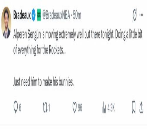 火记Bradeaux:申京今晚在场上移动得极为出色。为火箭队贡献了全方位的表现,他只需要做好自己就行。